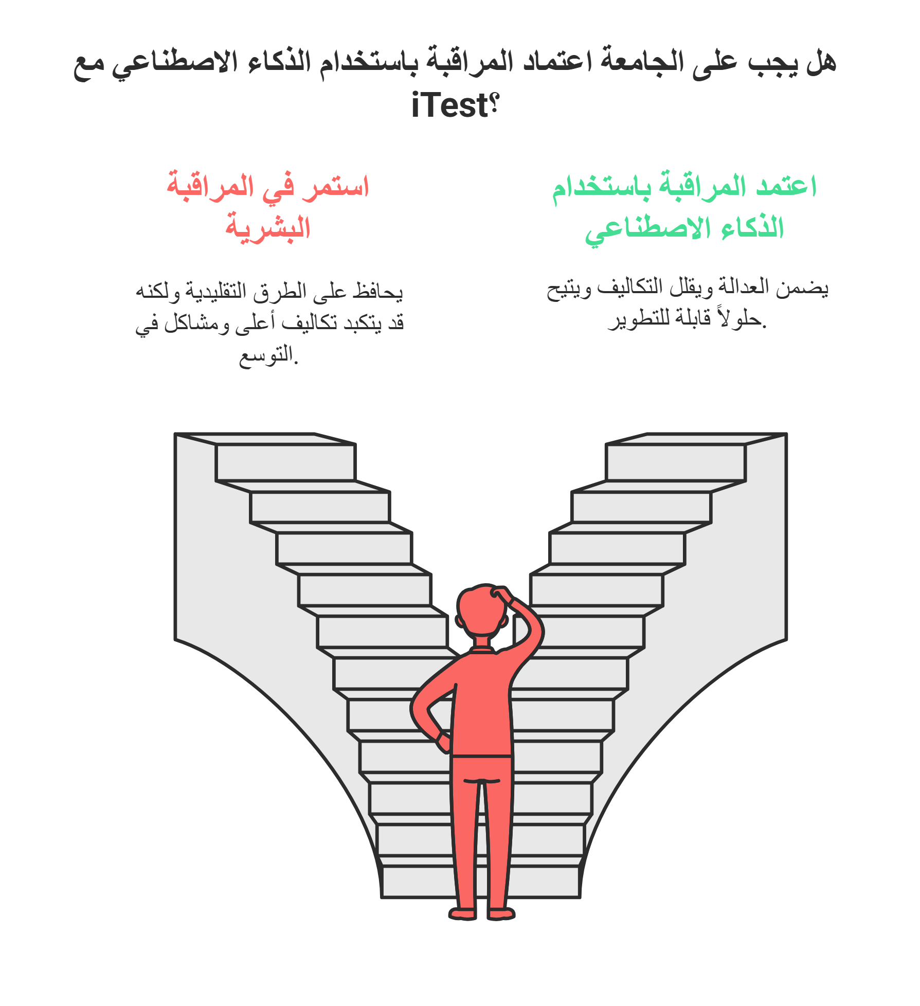 بينما لا تزال المراقبة البشرية لها دورها، فإن المراقبة بالذكاء الاصطناعي هي المستقبل. مع iTest، يمكن للجامعات ضمان العدالة، وتوفير التكاليف، والتوسع بسهولة.